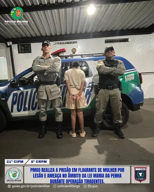 LEI MARIA DA PENHA PMGO REALIZA A PRISÃO EM FLAGRANTE DE MULHER POR LESÃO E AMEAÇA NO ÂMBITO DA LEI MARIA DA PENHA DURANTE OPERAÇÃO TIRADENTES